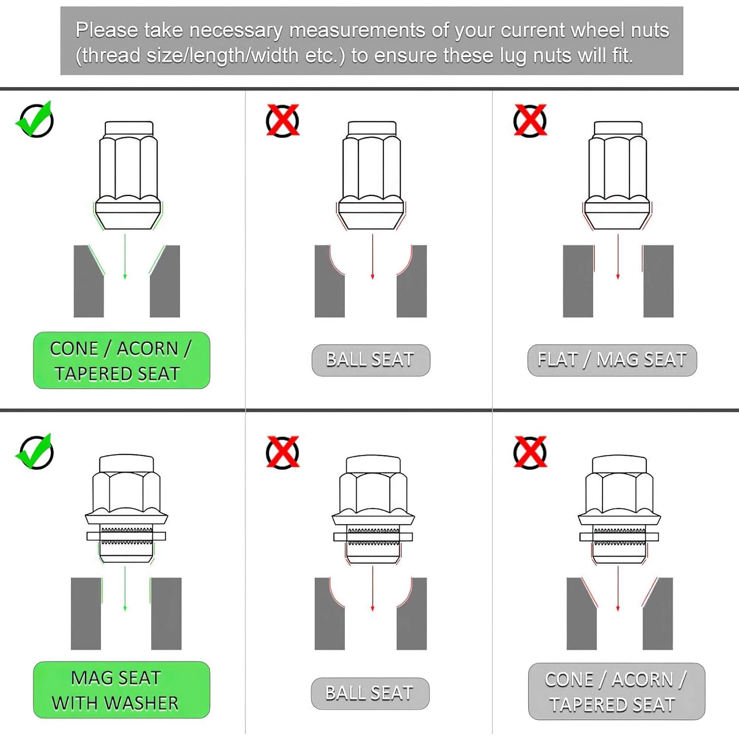 Each one is designed to securely seat and tightly fit mag wheels. NoC Verify lug nut to wheel mating surface for proper and safe fitment. Vehicles with 60 degree conical seat also known as cone seattapered seat.